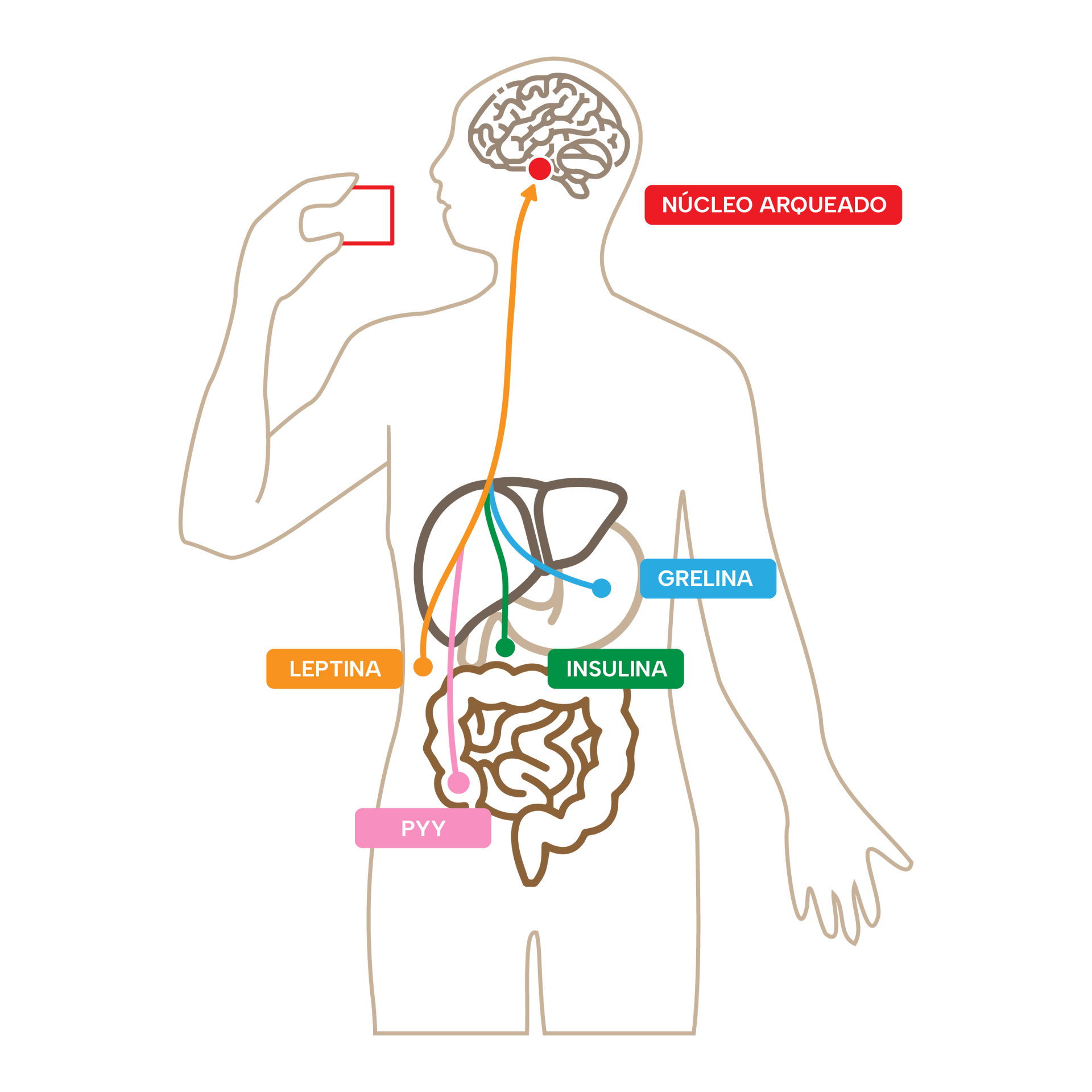 Empezamos a sentirnos saciados en respuesta al volumen de comida y las calorías ingeridas. Diversas señales comunican el estado actual de disponibilidad de energía (principalmente a través del nervio vago) al rombencéfalo. Estas señales incluyen la grelina, los péptidos intestinales (como el péptido tirosina-PYY, la colecistoquinina-CCK y el péptido similar al glucagón-1-GLP-1), la insulina, la amilina (una enzima que ayuda a digerir las proteínas) y la leptina. Todas estas señales llegan a parar a un circuito neuronal encargado de hacernos sentir saciados, constituido por las neuronas del péptido relacionado con el gen de la calcitonina (CGRP) del núcleo parabraquial (PBN), que suprimen la ingesta de alimentos cuando se activan, pero no la aumentan cuando se inhiben.