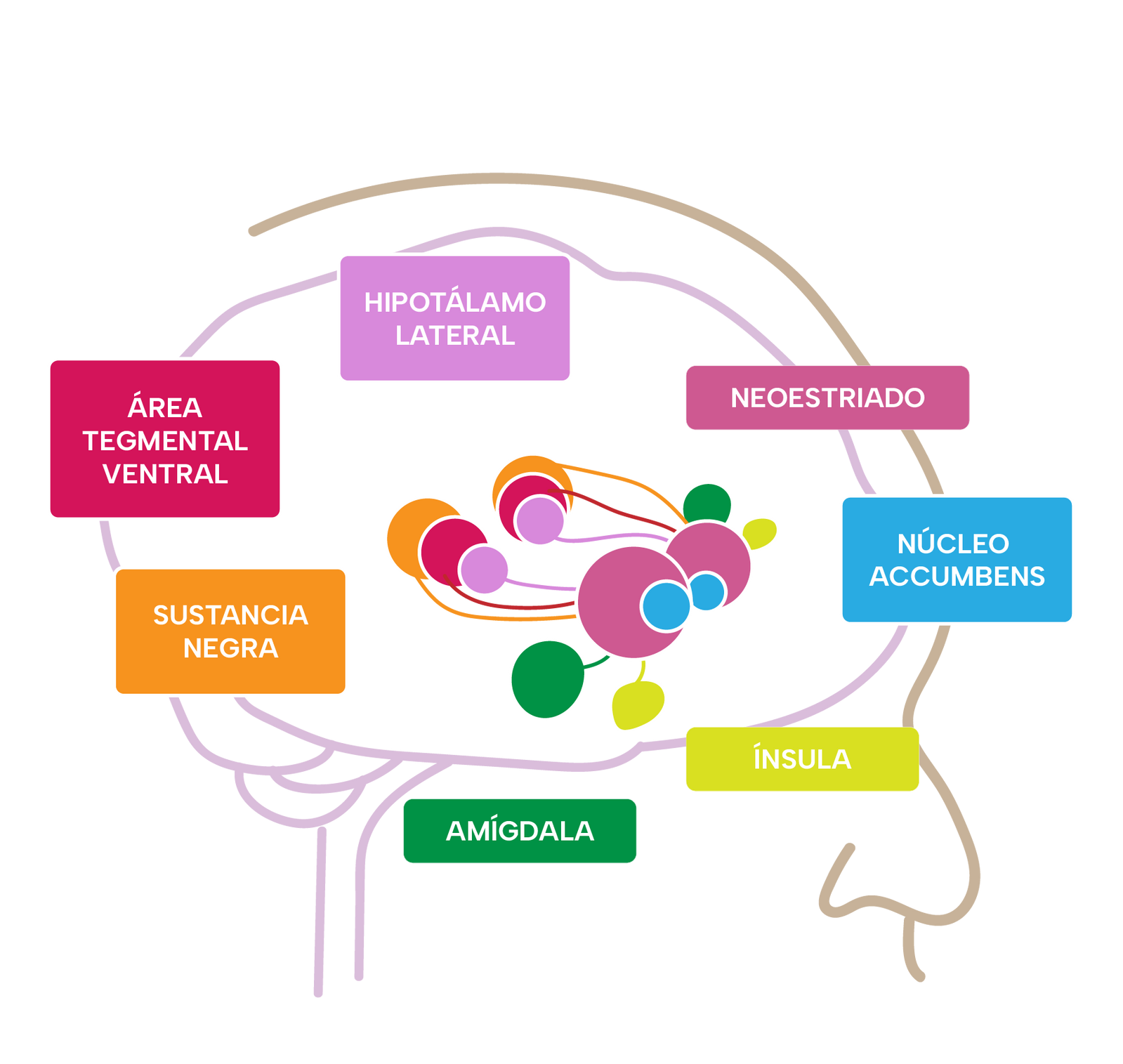 Al tener comida delante, la activación de las neuronas AGRP decae para dar pie a la activación del hipotálamo lateral (HL), otra región pequeña pero conservada evolutivamente en el centro del cerebro que está fuertemente conectada con los centros de recompensa del cerebro, como el área tegmental ventral, el cuerpo estriado ventral, la sustancia negra y el núcleo accumbens. De hecho, en base a estudios en murinos, parece que el LH obedece más a los propios deseos de encontrar placer y recompensa que a la necesidad de comida (6,7).